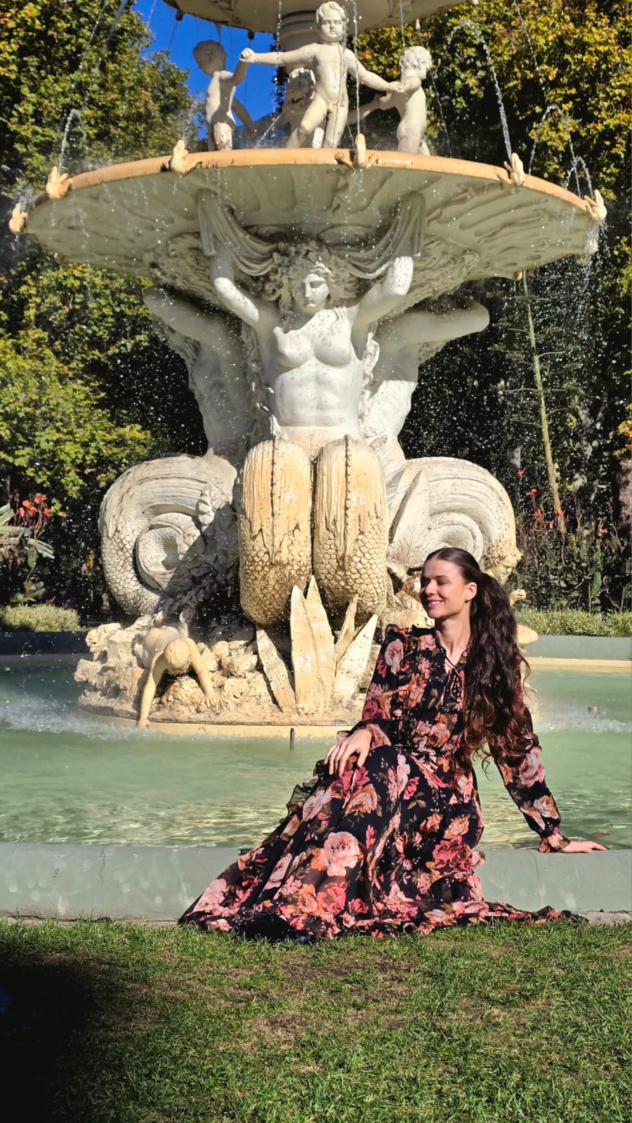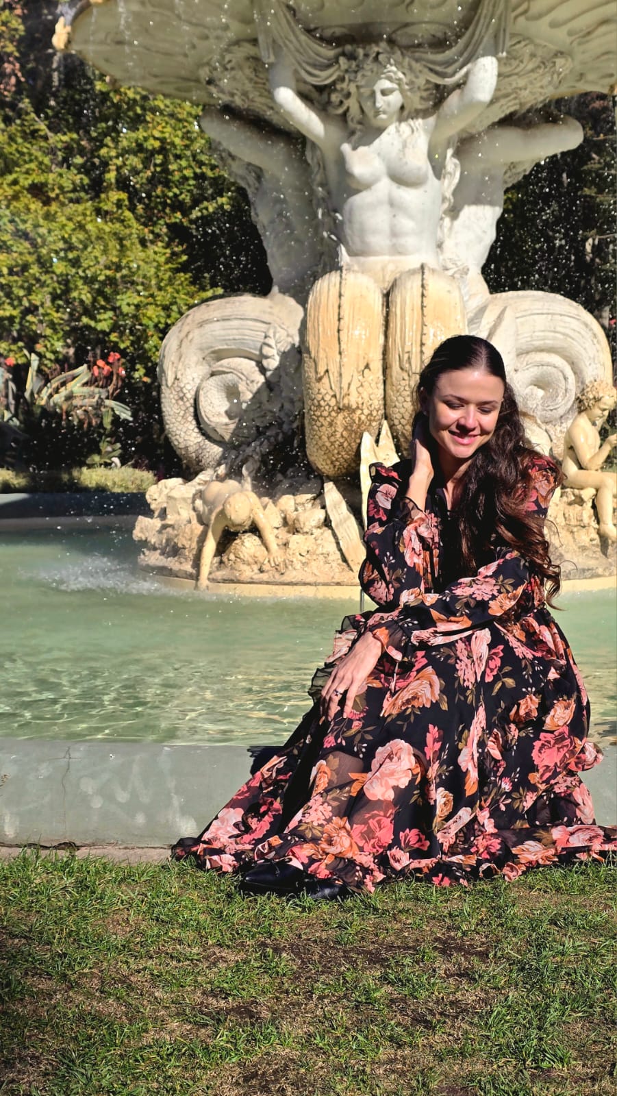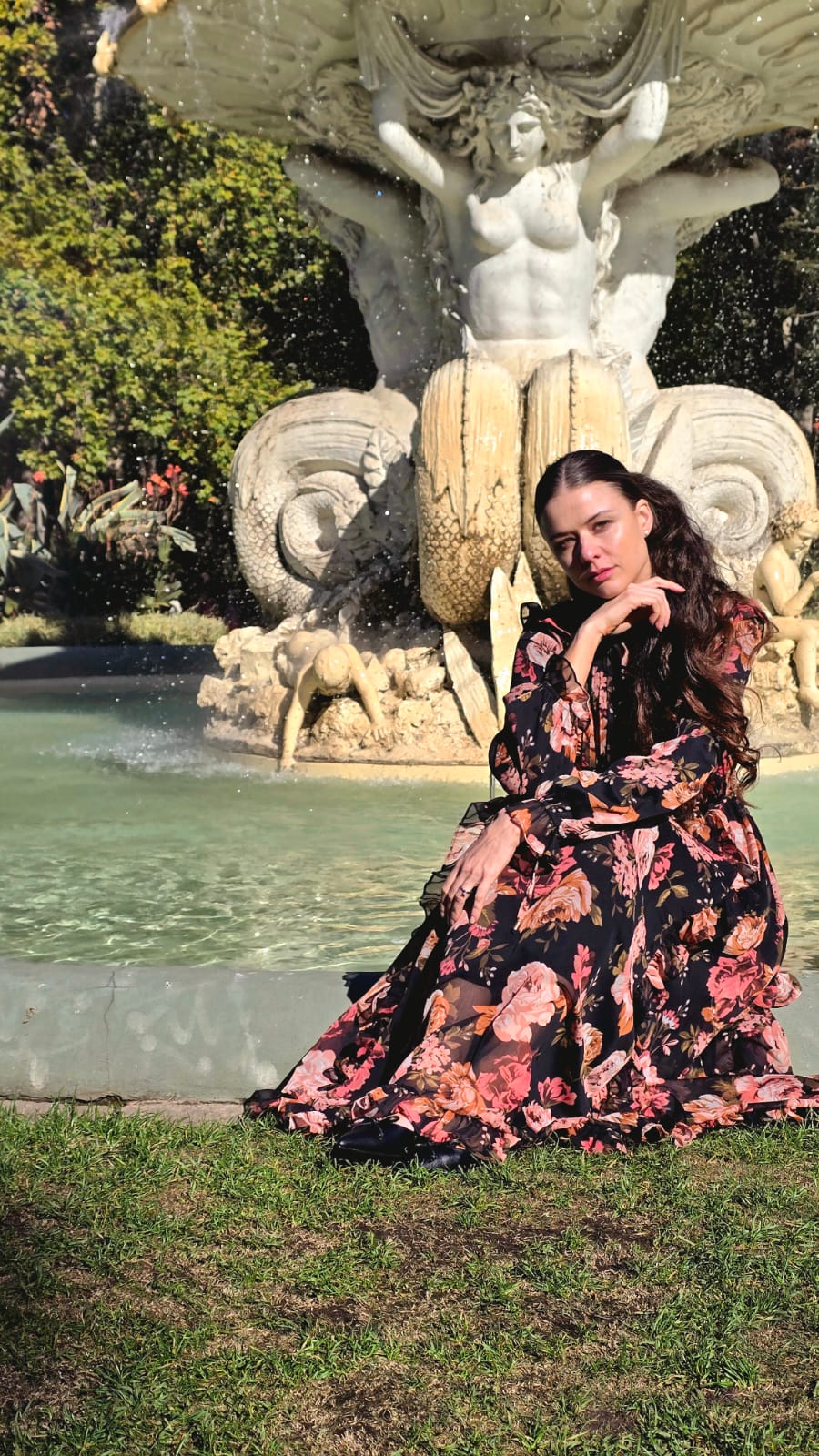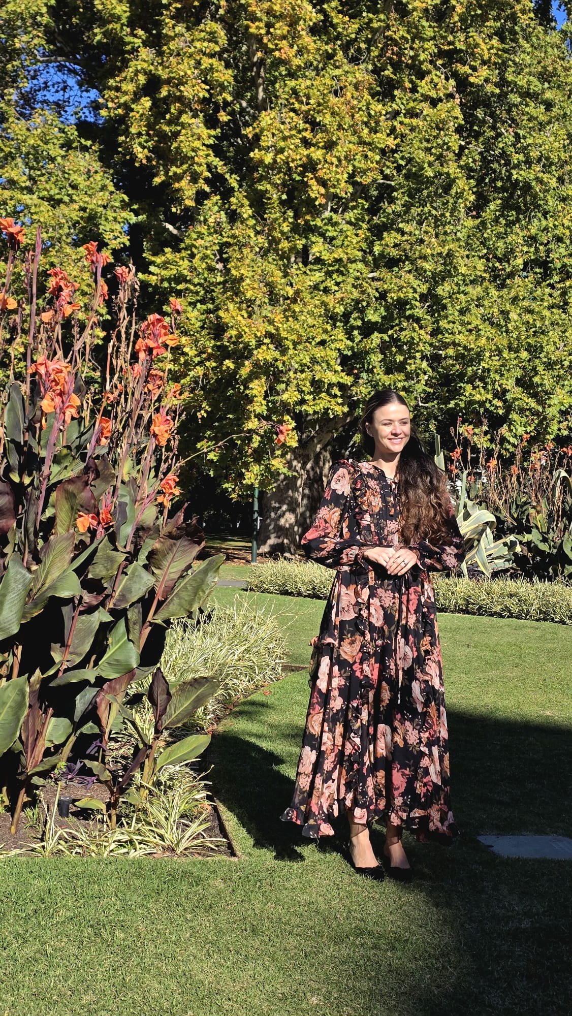 Crafted from lightweight chiffon, this dress features full lining and delicate ruffled accents along the shoulders, bodice, and skirt. It includes an elasticated waist with an adjustable tie for a customized fit, complemented by a V-neckline with a tie detail. The skirt flows gracefully, enhanced by a ruffle trim for added movement and elegance.
