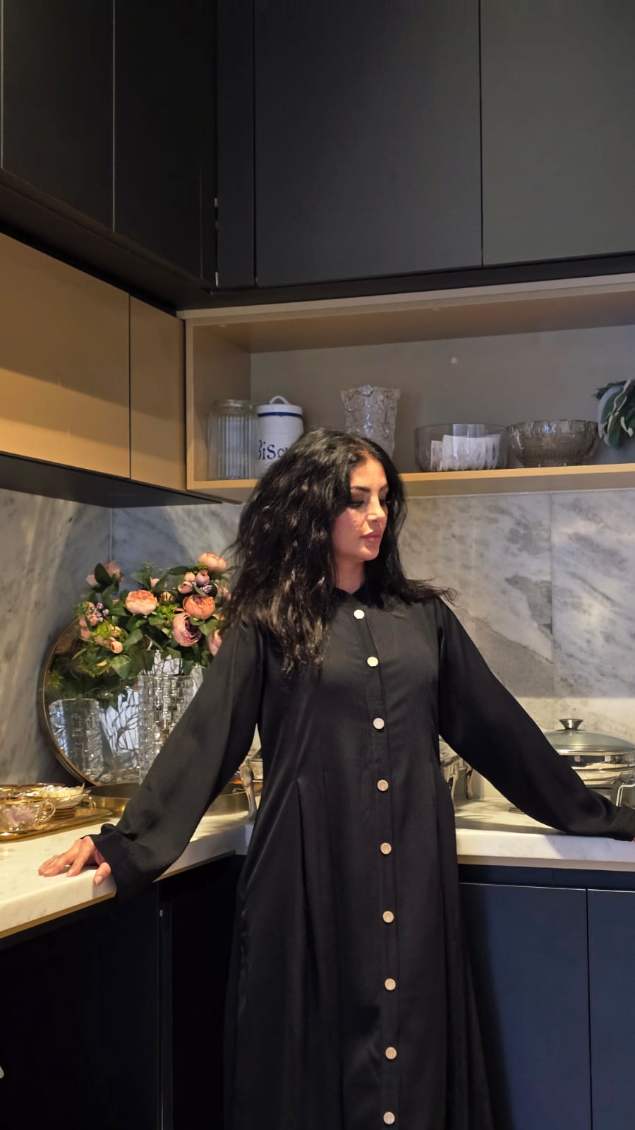 Elegant black hue that adds a soft, regal touch. Gold buttons run down the front, offering a luxurious accent. Flowy silhouette crafted from soft, draping fabric for graceful movement. Front-open design for ease and versatility in styling. Long, slightly wide sleeves for modest coverage. High collar detail, adding a structured, refined edge. Subtle pleats from the waist down for added volume and femininity.