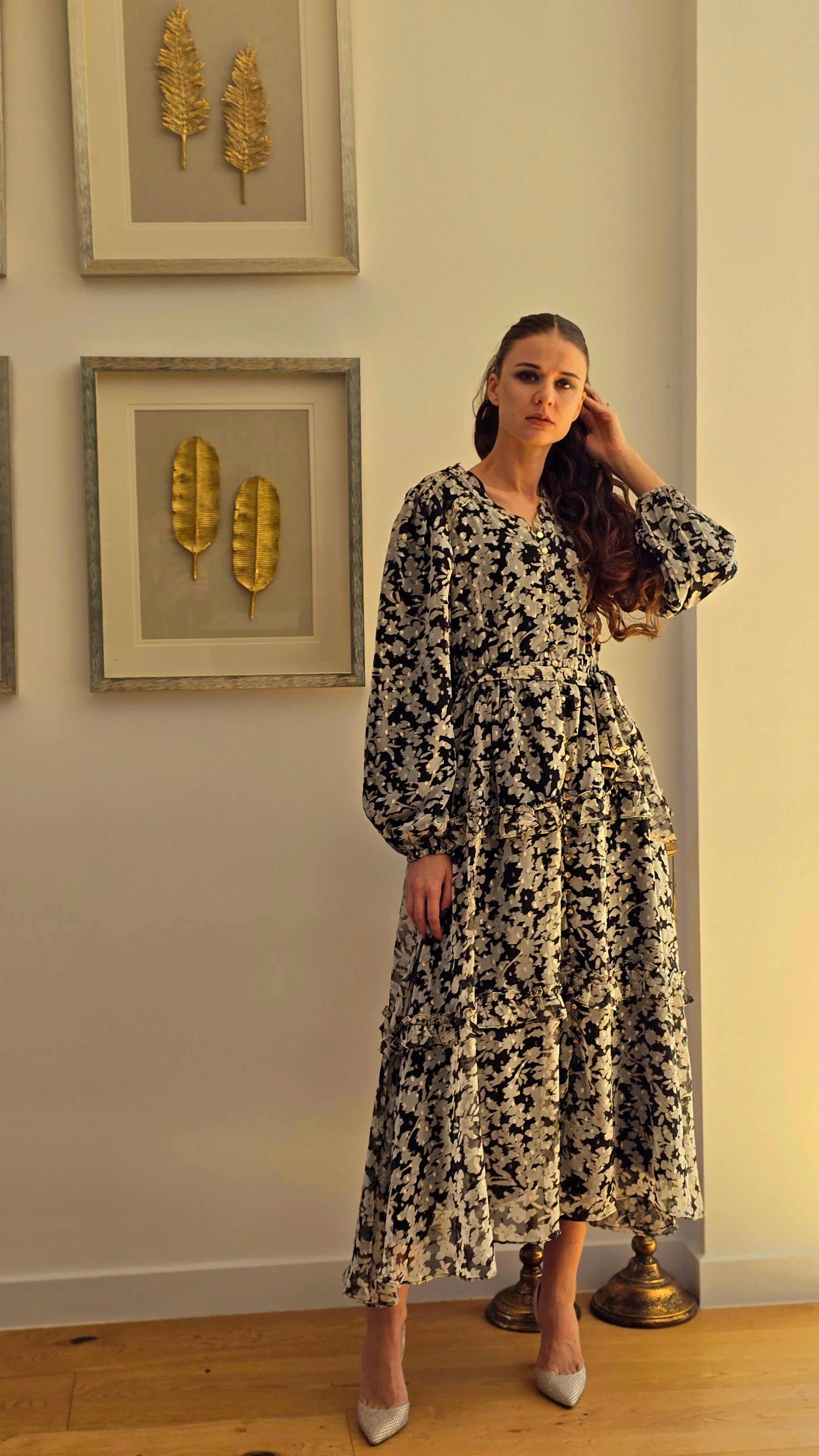Featuring regular fit, premium chiffon fabrication, fully lined, high neckline with ruffle trim, removable waist tie and button through front.