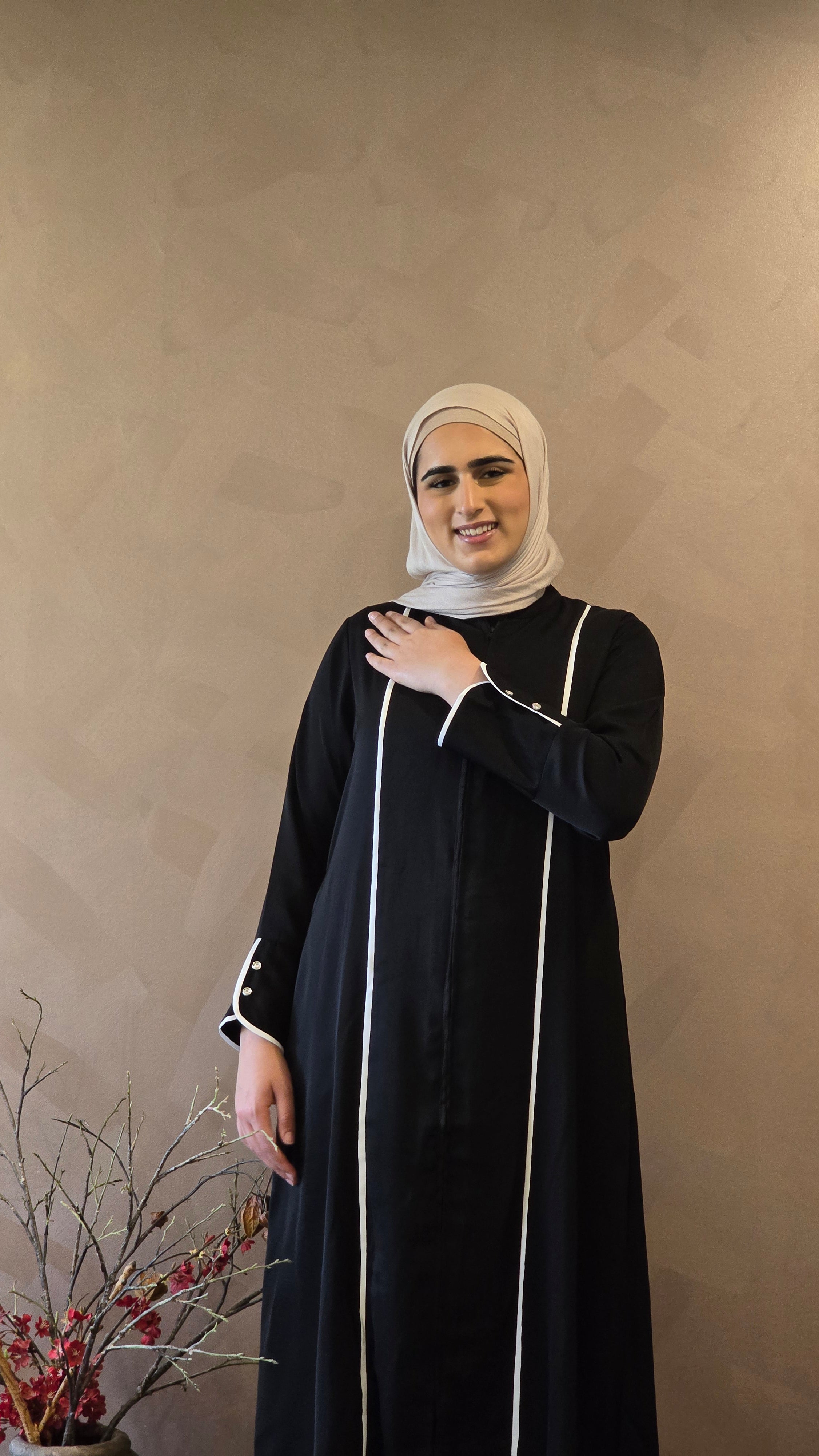 Black abaya with crisp white piping for a clean, modern finish. Lightweight and modest, it flows effortlessly for everyday elegance.