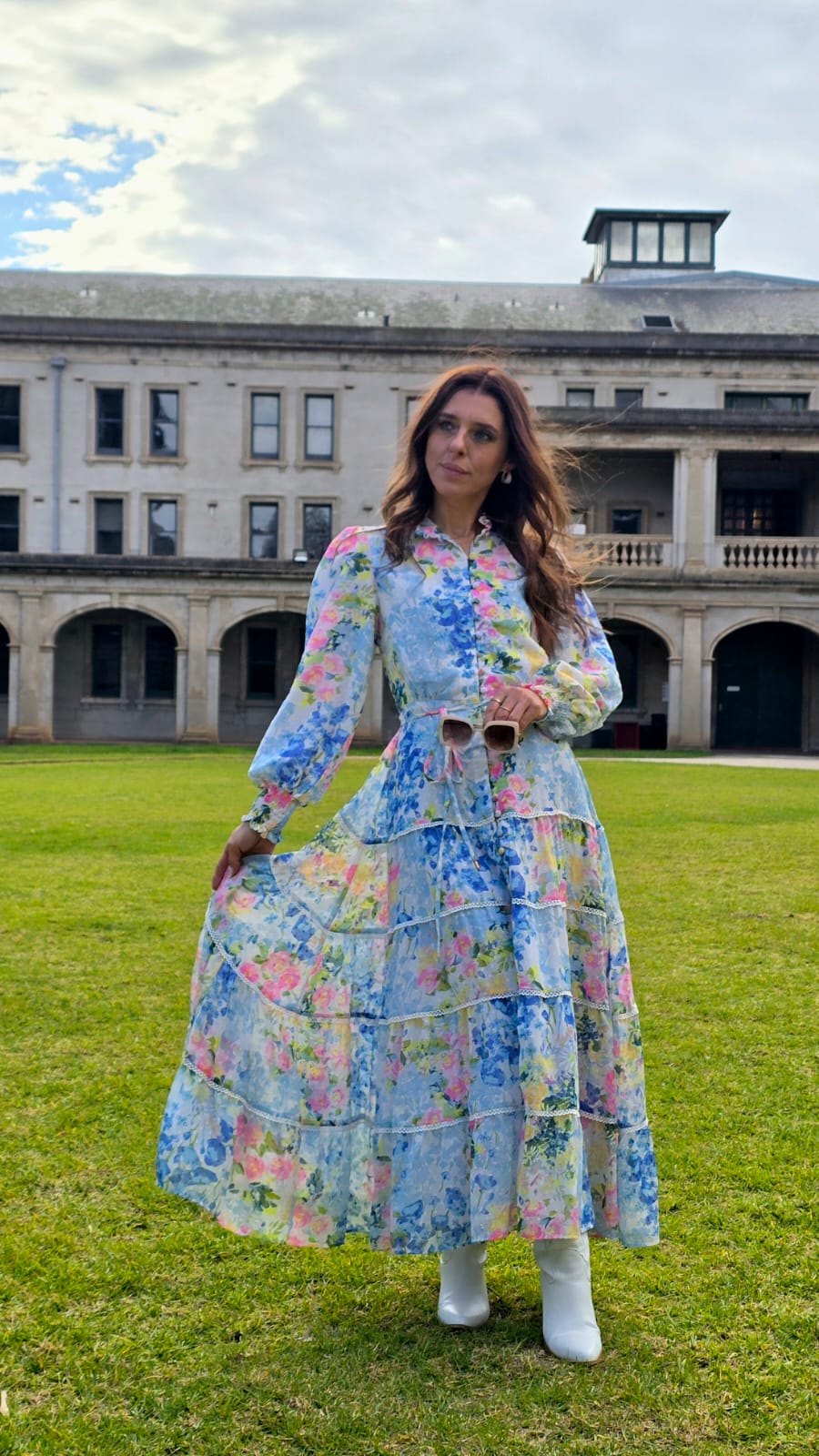 Lightweight chiffon fabric with a soft, flowing drape Fully lined for added comfort and modesty Tiered skirt design with romantic lace trimming on each tier Elasticated shirred sleeves for a touch of volume and stretch High collar neckline for a refined and modest finish Button-front closure for ease and a classic look Maxi length for an elongated, graceful silhouette Elastic back waist for flexible fit; flat front waist for structure Removable waist tie for adjustable styling.