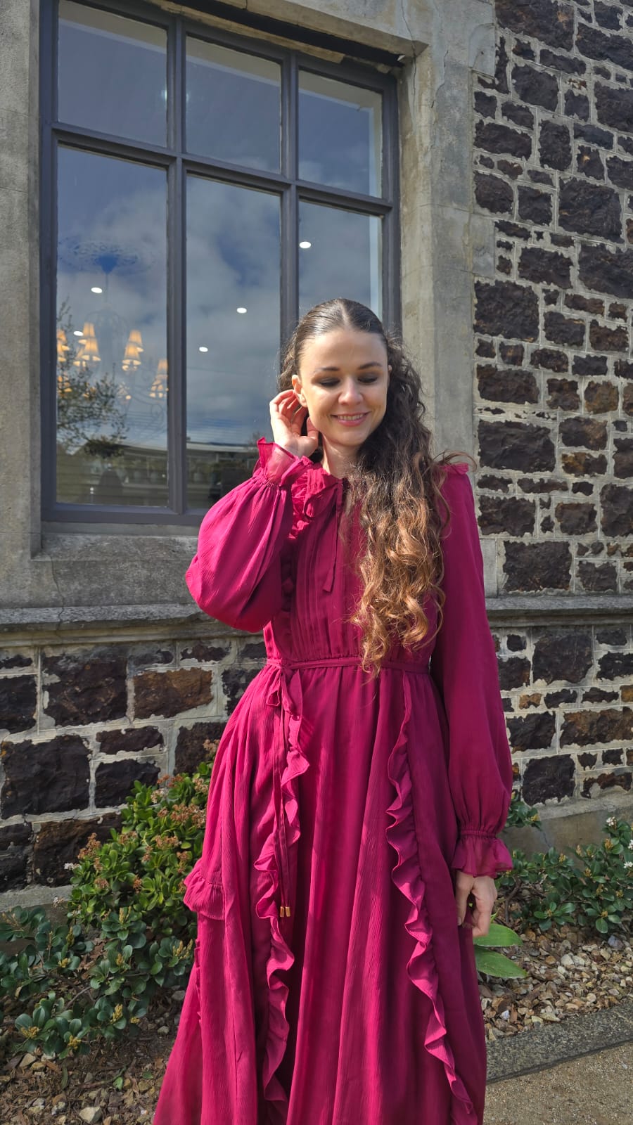 Lightweight chiffon fabric with a soft, airy drape Fully lined for added comfort and modest coverage Ruffled trims throughout the shoulders, bodice, and skirt for romantic texture