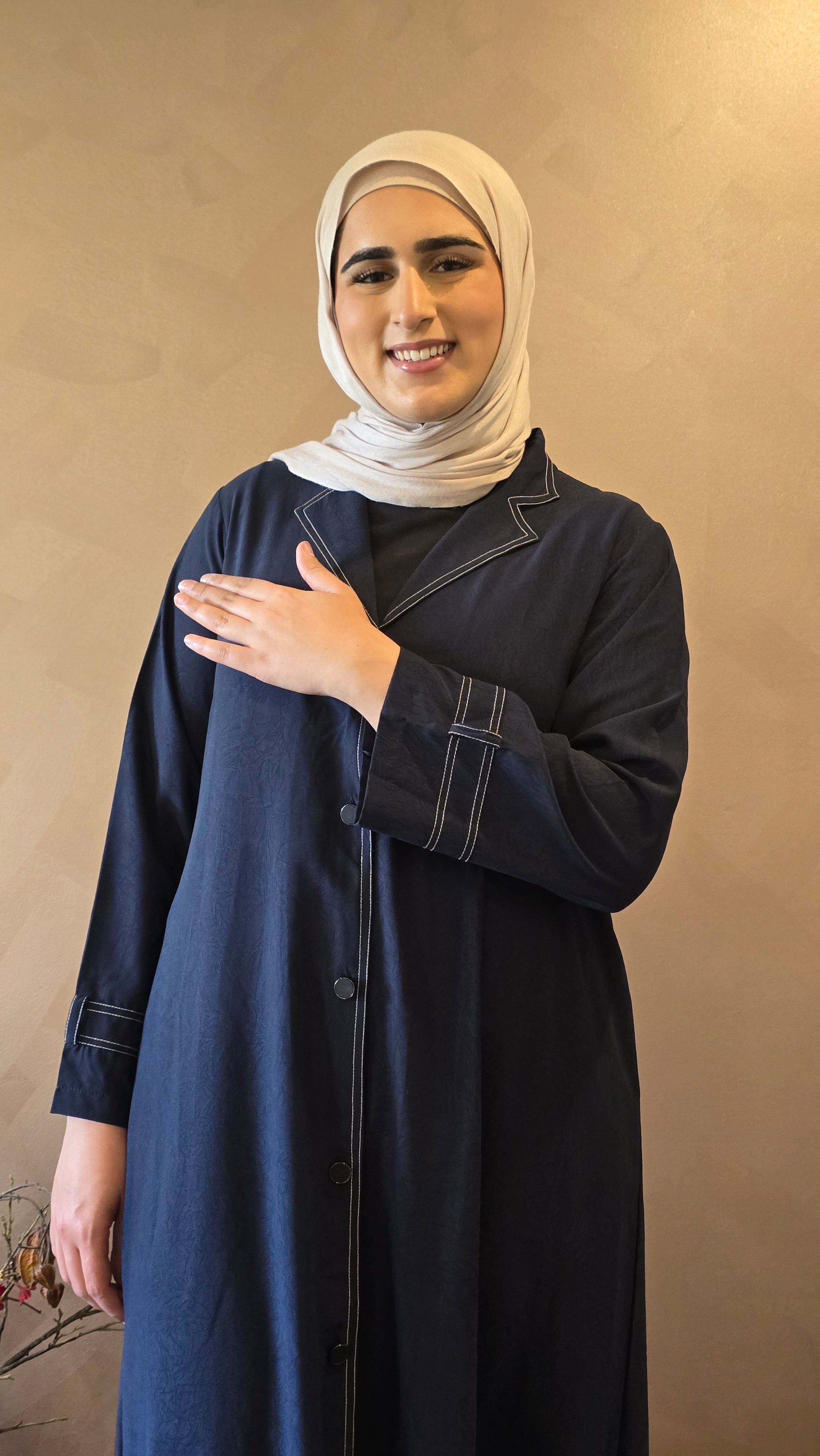 - Long sleeves with tailored seams for a modest, structured silhouette