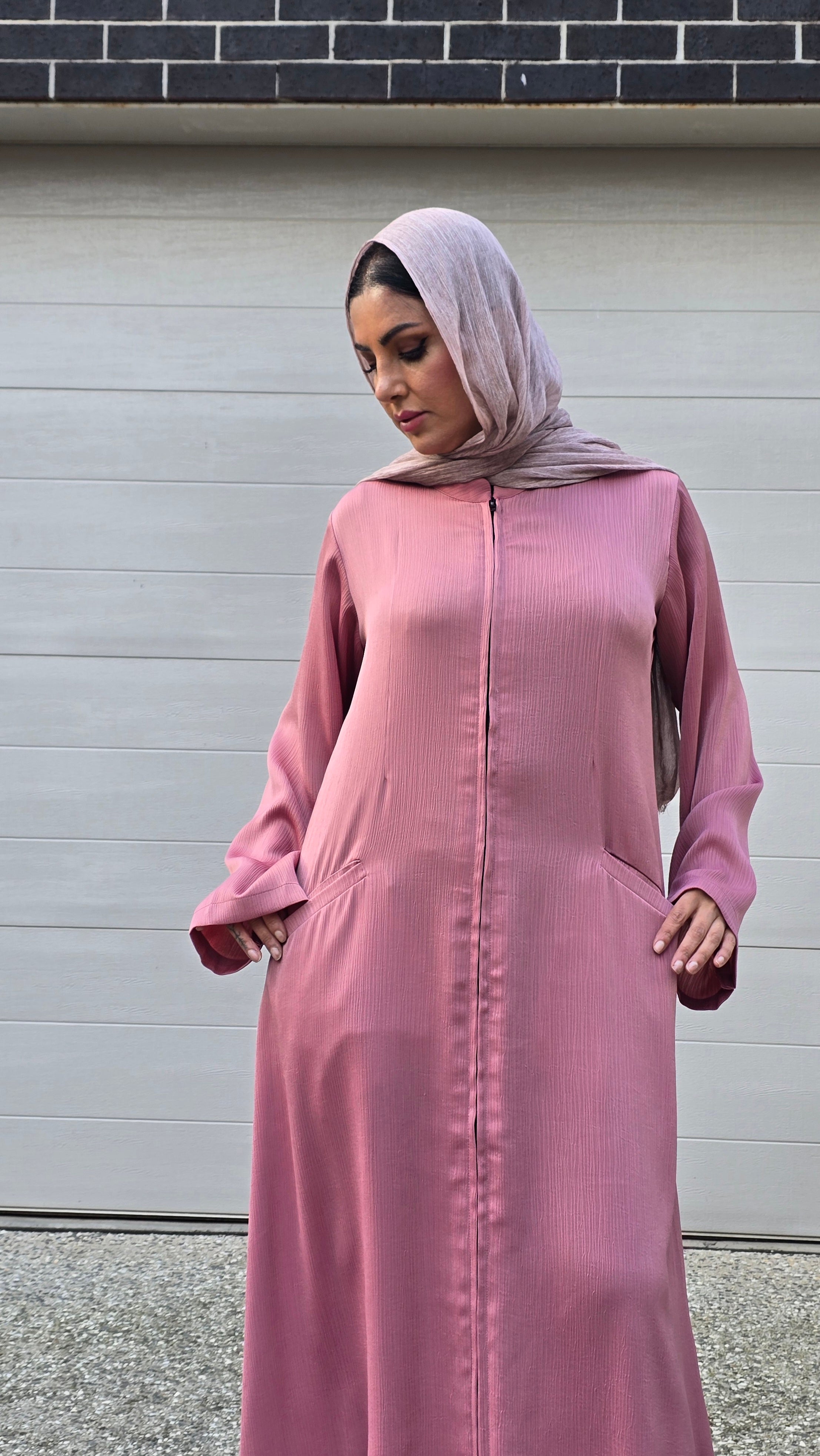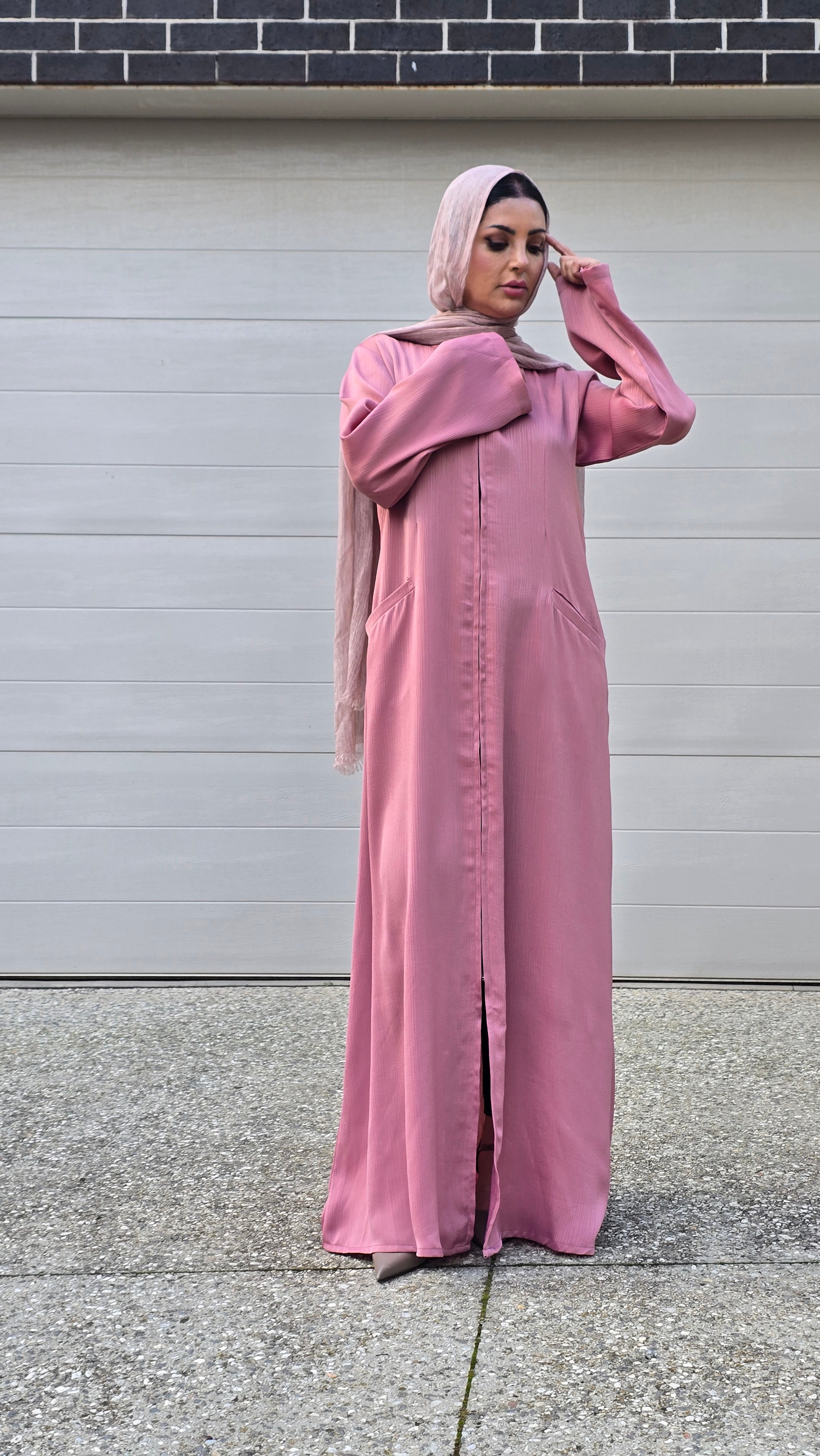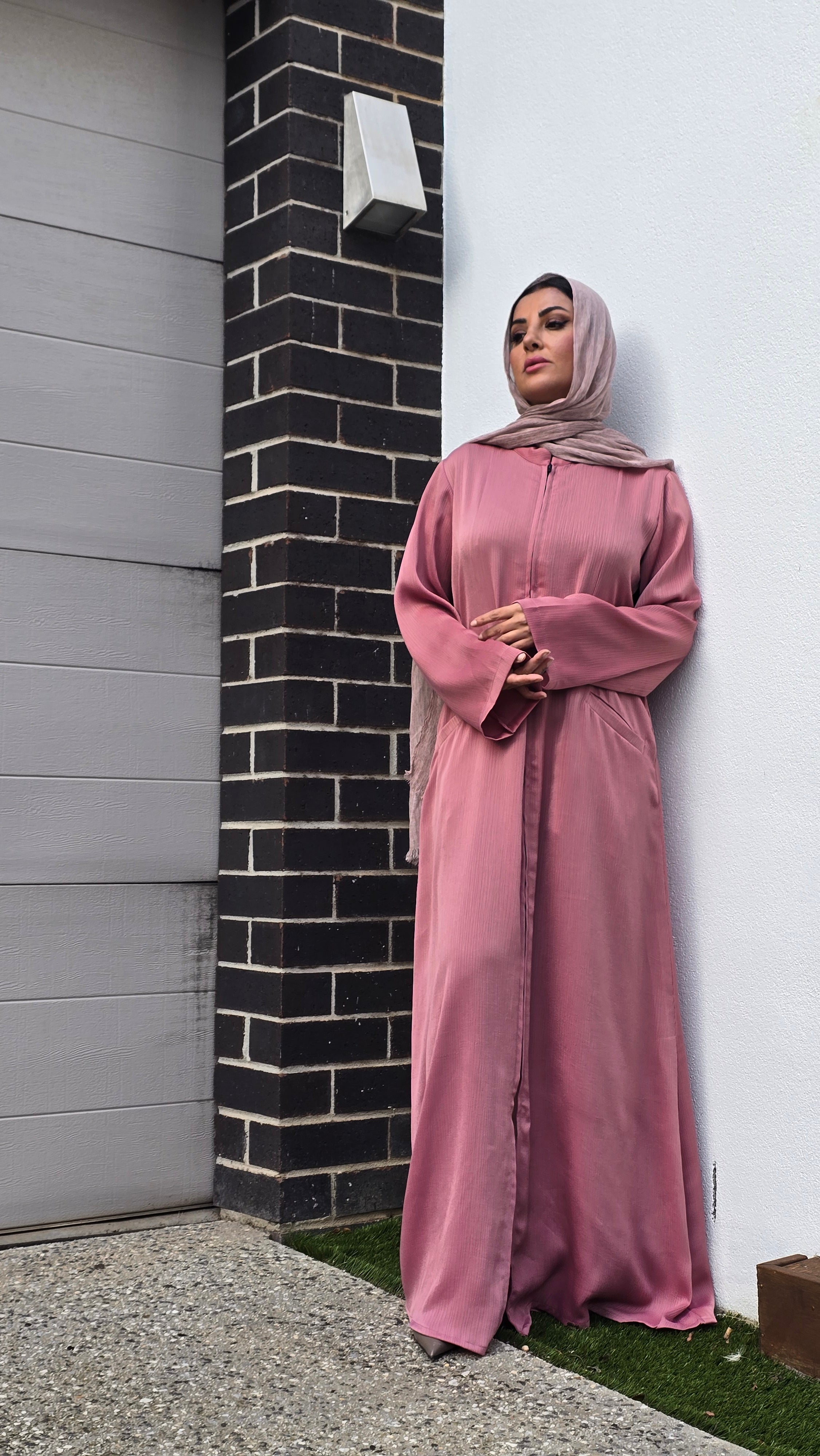 - Dusty‑pink abaya with a smooth, minimal, contemporary silhouette