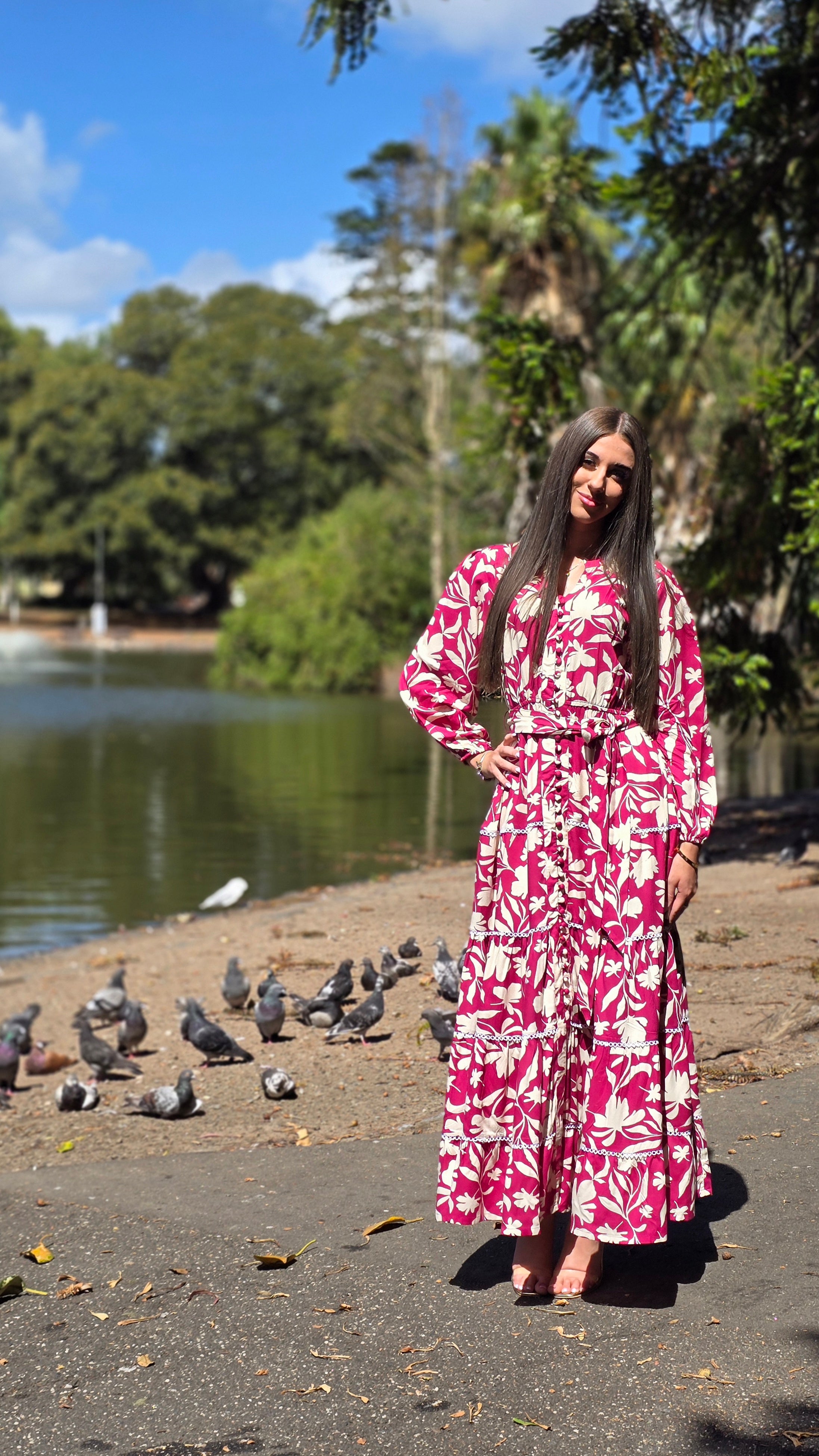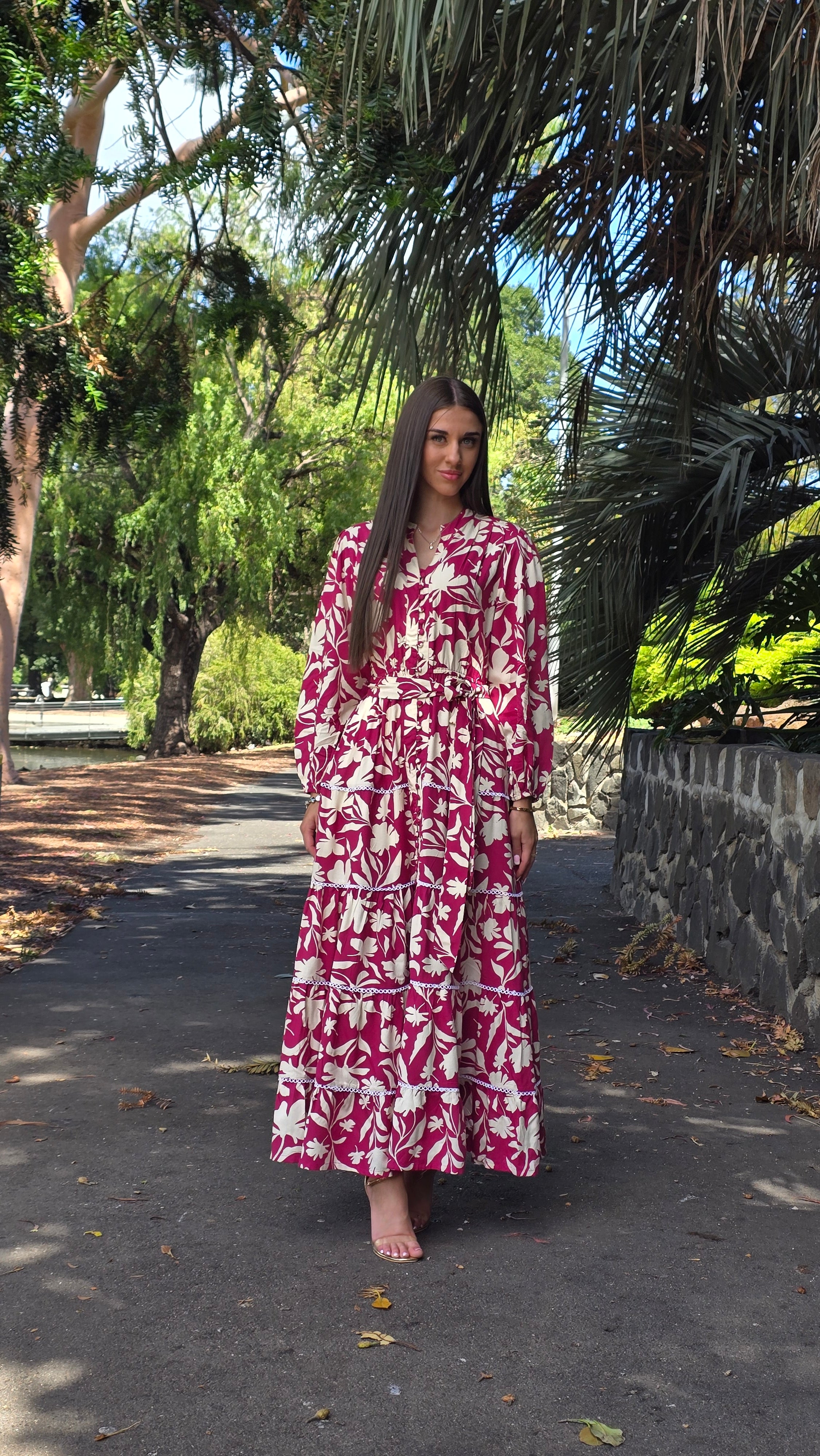 An effortlessly elegant tiered maxi dress designed for comfort and modest style. Featuring a flattering button-front bodice, adjustable waist tie, and elasticated waist and sleeves for the perfect fit. Delicate white lace trims add a feminine touch to each tier, while the breathable, non-sheer fabric makes it ideal for warm days. Lightweight and flowy, this dress is perfect for everyday wear, gatherings, or special occasions.