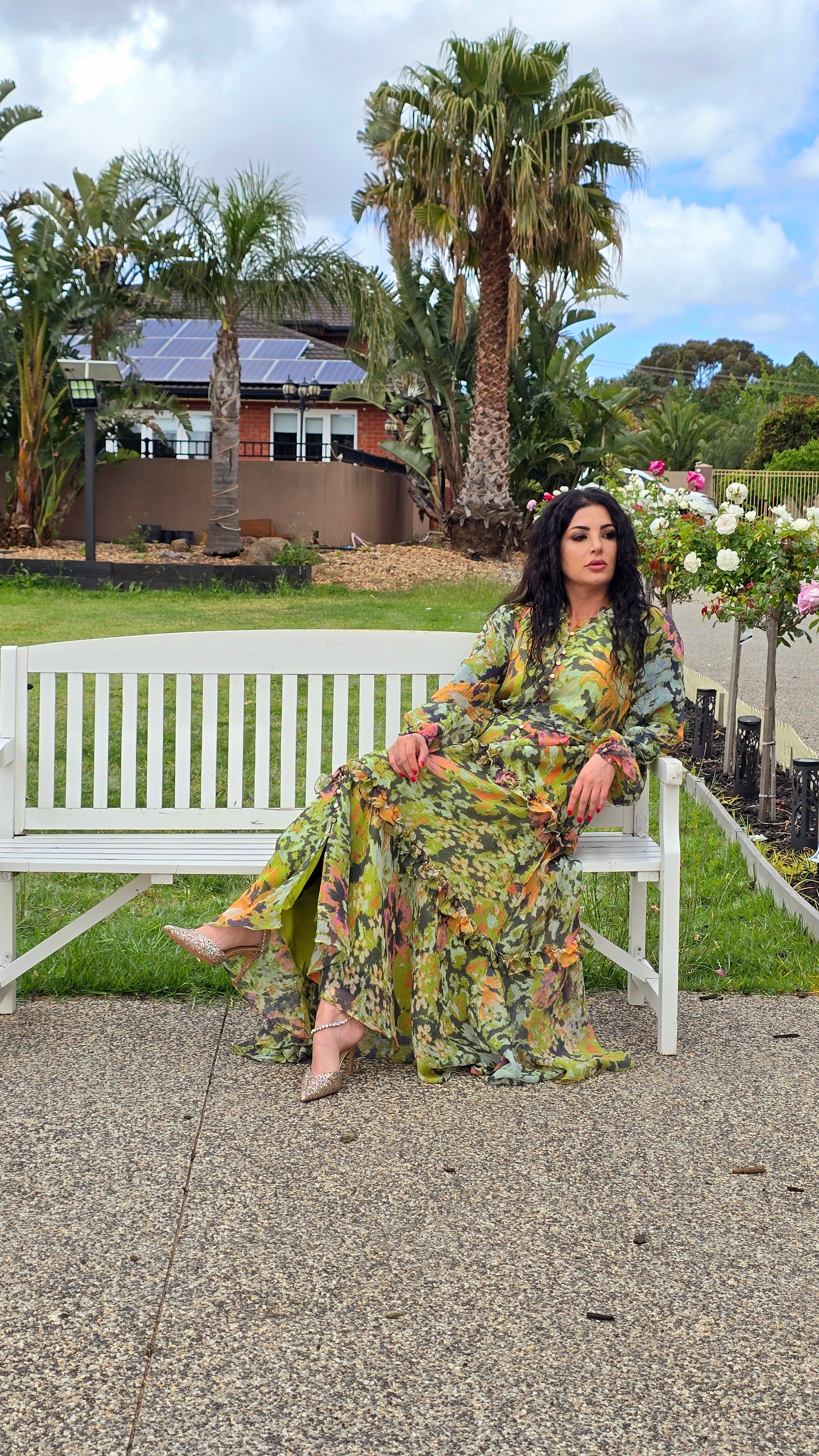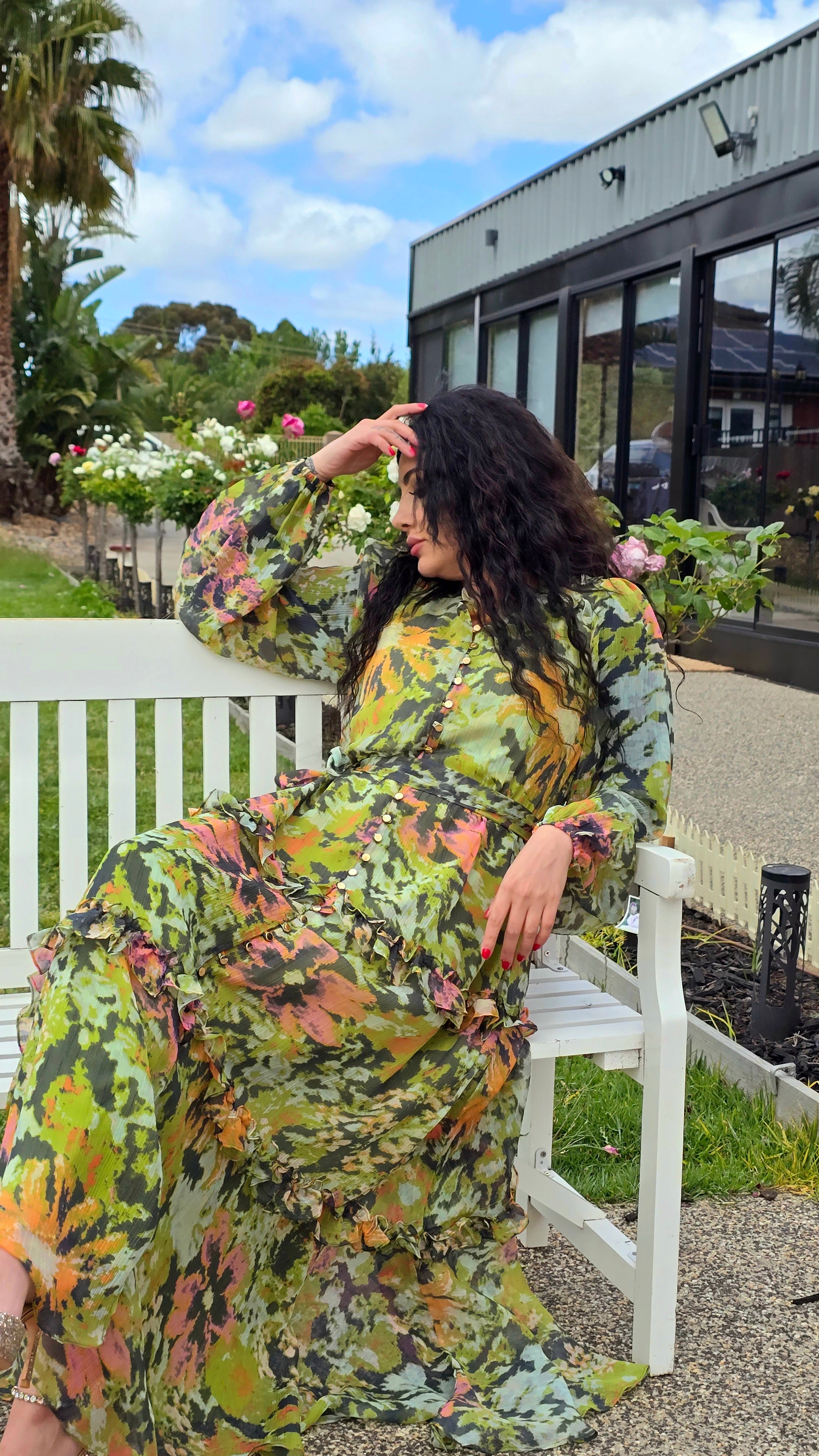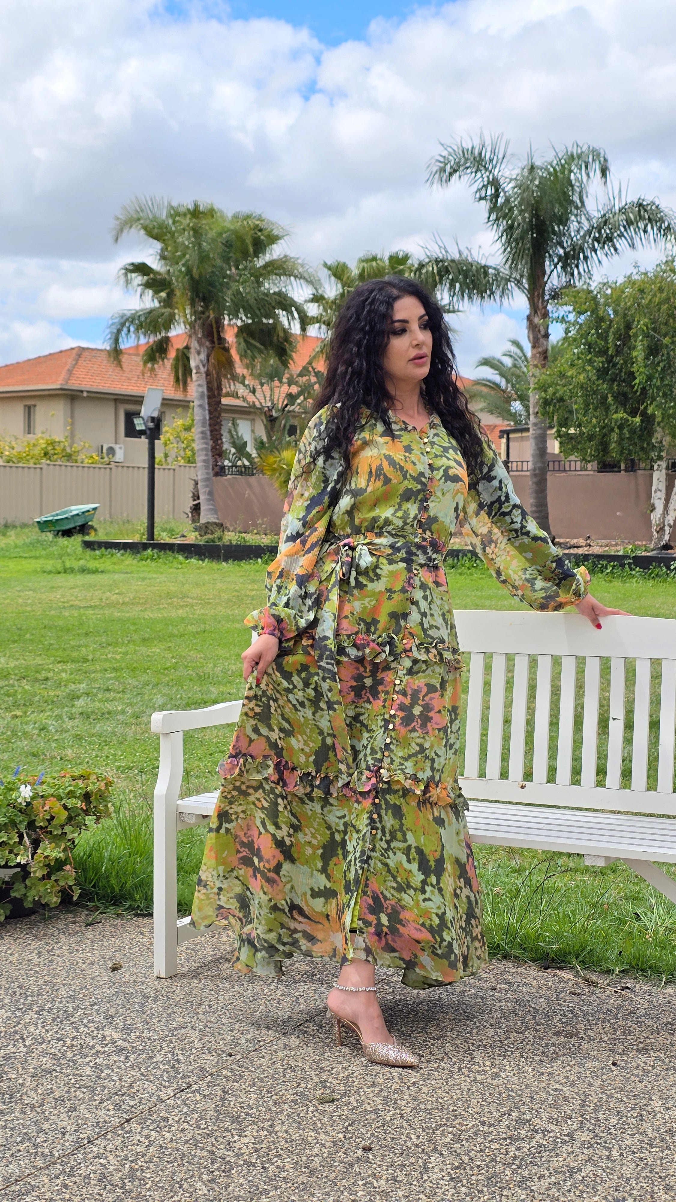 This dress features a regular fit crafted from premium chiffon with full lining for comfort. It showcases a high neckline adorned with delicate ruffle trim, a button-through front, and includes a removable waist tie for versatile styling.
