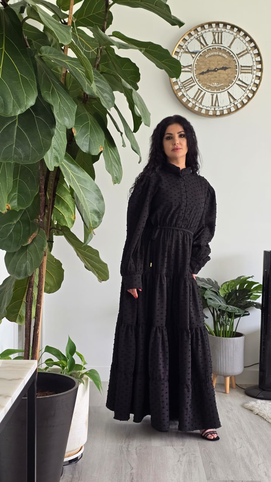 This dress features a tiered skirt with opaque fabric, cuffed sleeves, and an elasticized waist for a comfortable fit. It also includes a detachable waist tie for added styling versatility.