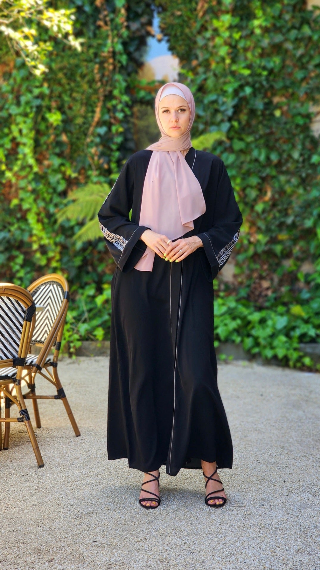 Minimal yet refined grey thread and black sparkle beads embroidery detailing on sleeves