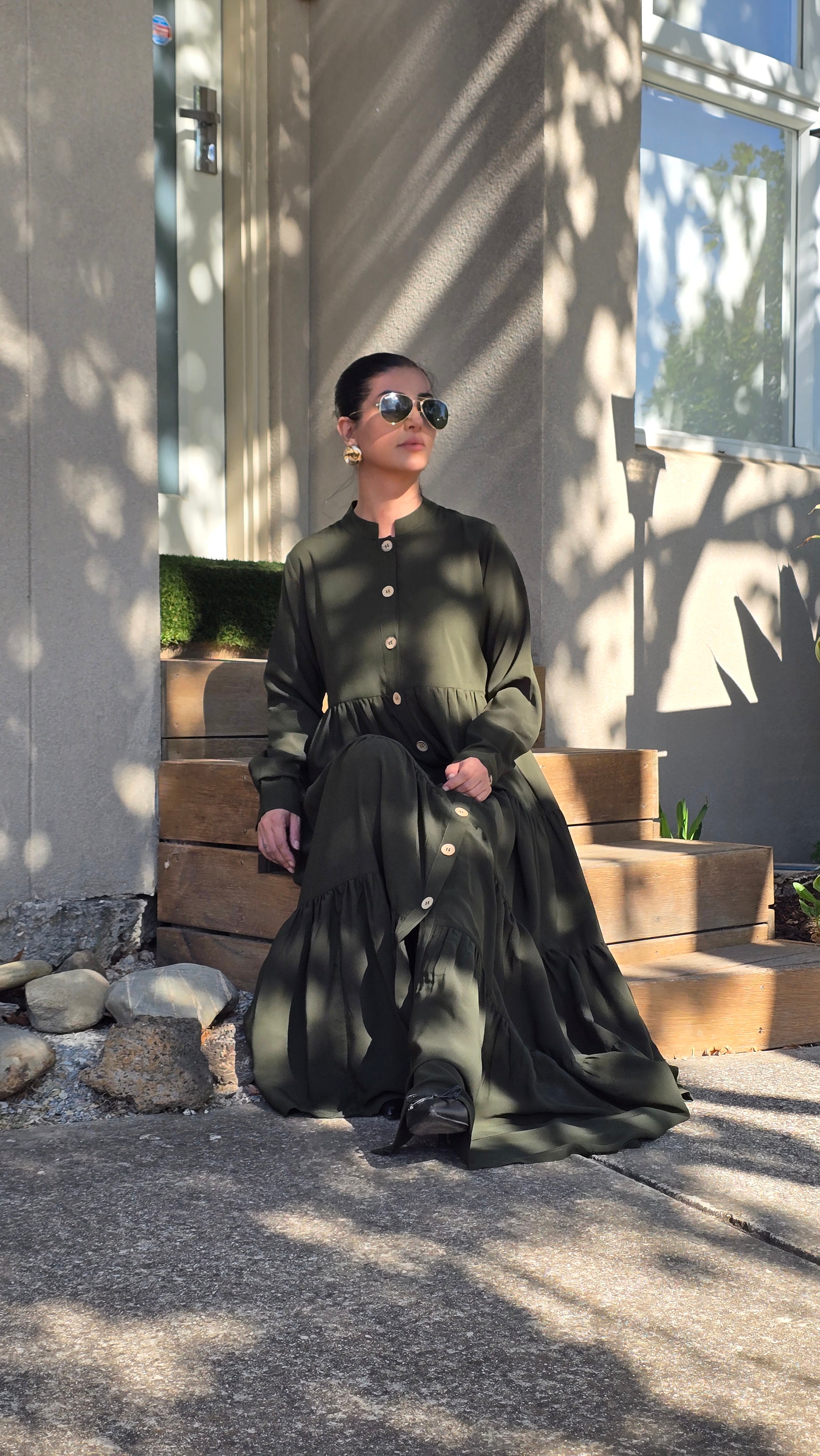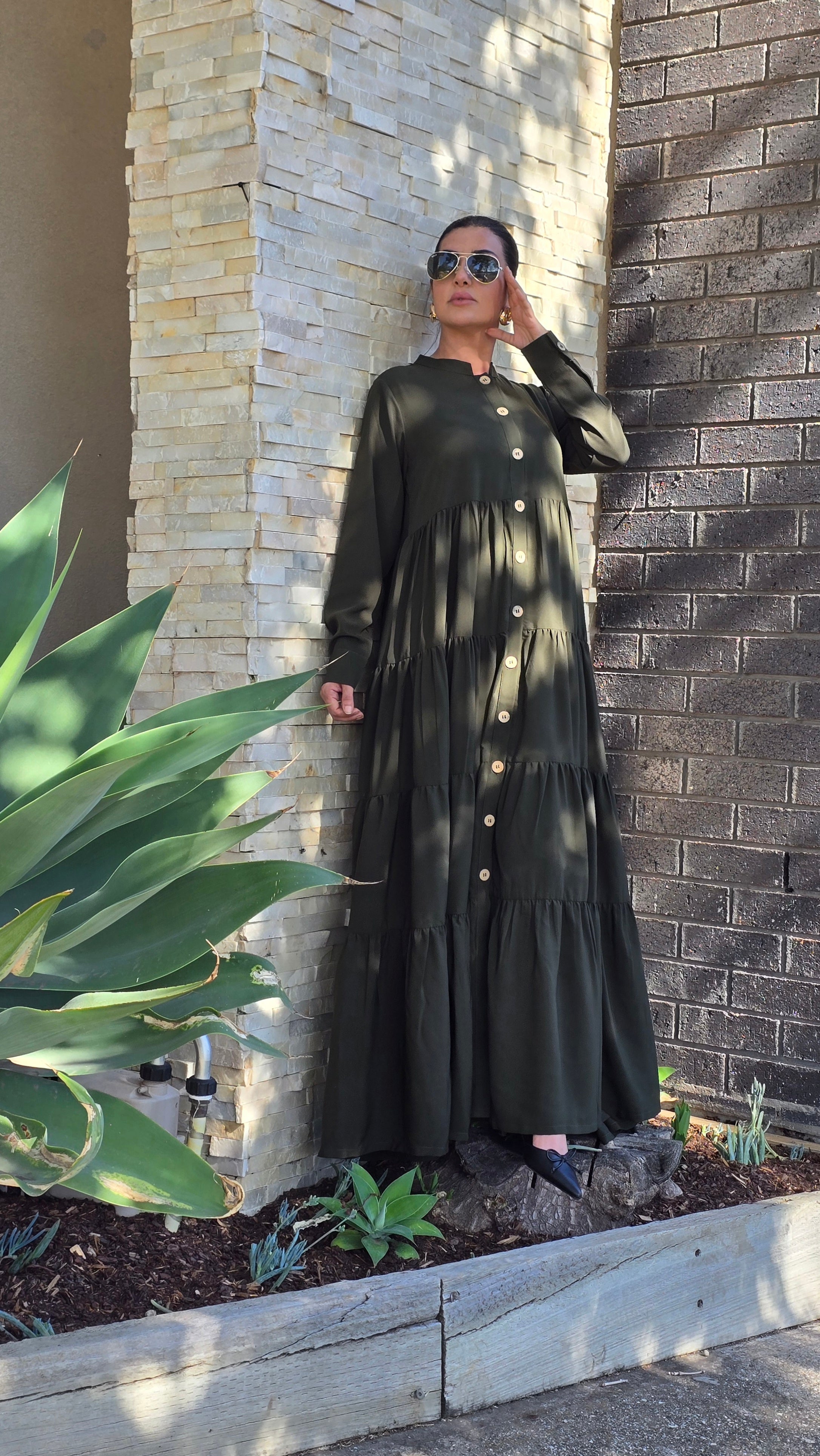 - Tiered silhouette with soft, gathered panels for graceful movement