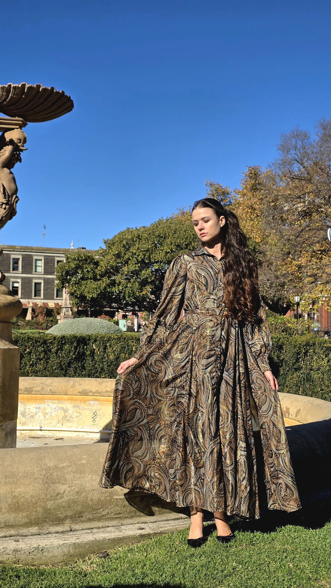 Crafted from lightweight chiffon, this maxi-length shirt dress features a collared neckline and is fully lined for comfort. It includes a button-down front with elegant rose gold buttons and is cinched at the waist with a D-ring belt for a refined silhouette.