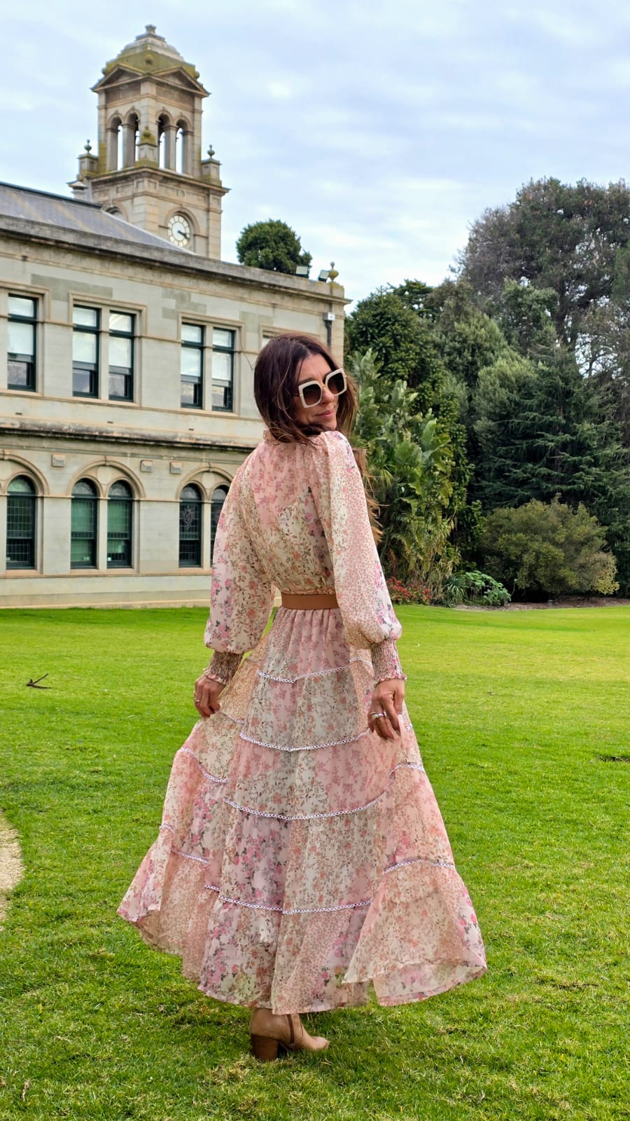 Lightweight chiffon fabric with a soft, flowing drape Fully lined for added comfort and modesty Tiered skirt design with romantic lace trimming on each tier Elasticated shirred sleeves for a touch of volume and stretch High collar neckline for a refined and modest finish Button-front closure for ease and a classic look Maxi length for an elongated, graceful silhouette Elastic back waist for flexible fit; flat front waist for structure Removable waist tie for adjustable styling.