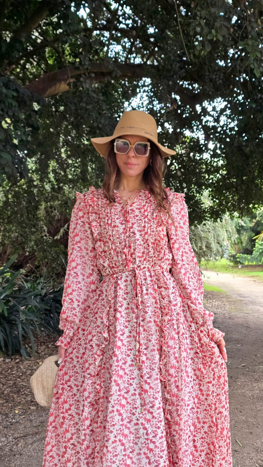 Flowing skirt enhanced with layered ruffle detailing for movement  Elasticated waist for a flattering, easy fit  Adjustable waist tie for personalized cinching and styling  V neckline with a delicate tie detail for added femininity.