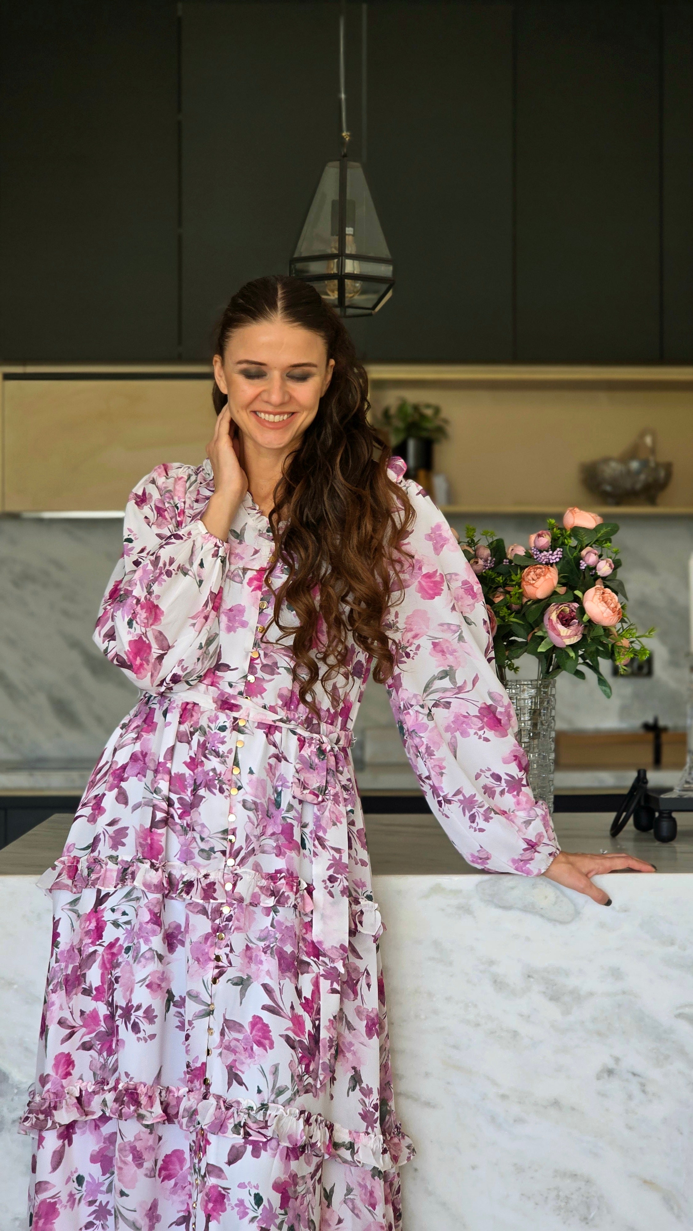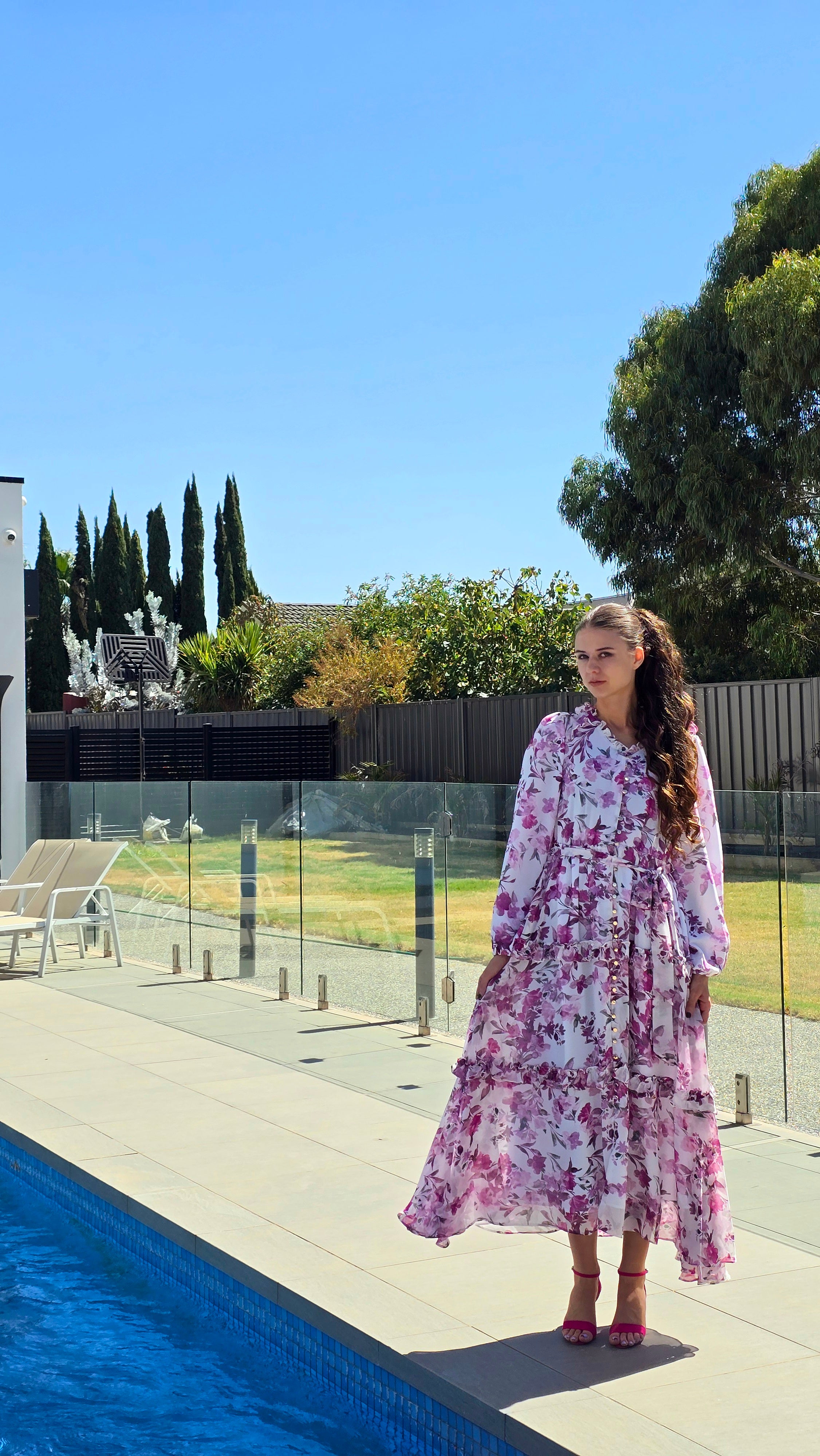 Featuring regular fit, premium chiffon fabrication, fully lined, high neckline with ruffle trim, removable waist tie and button through front.Style with strappy heels and a clutch to match.