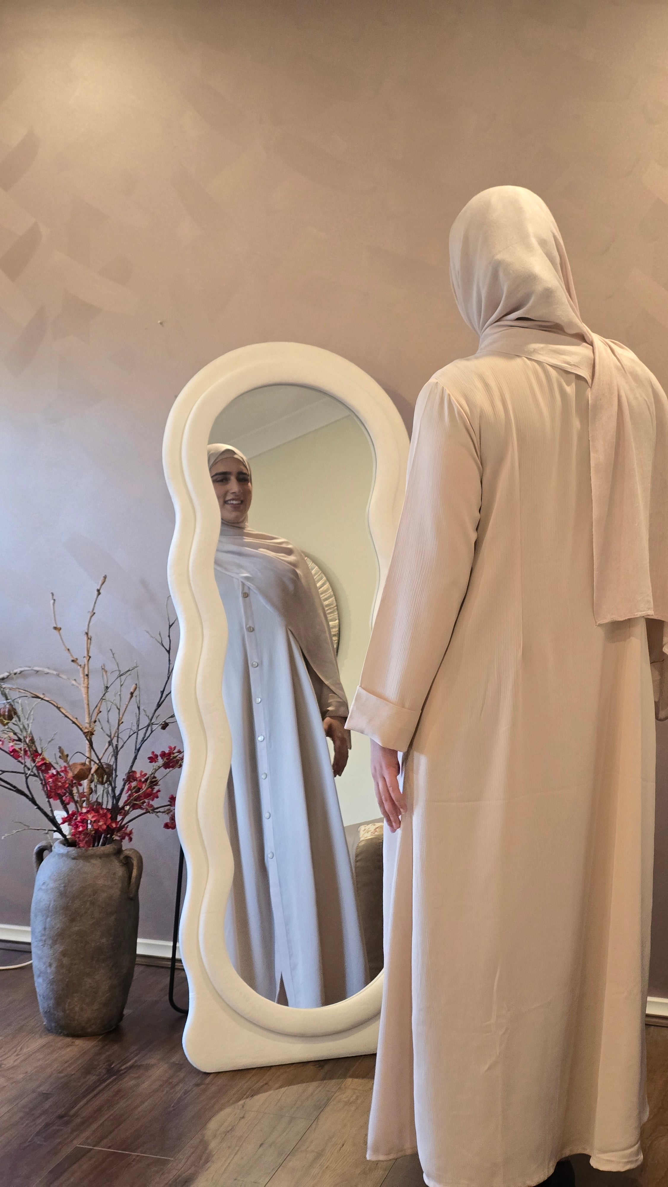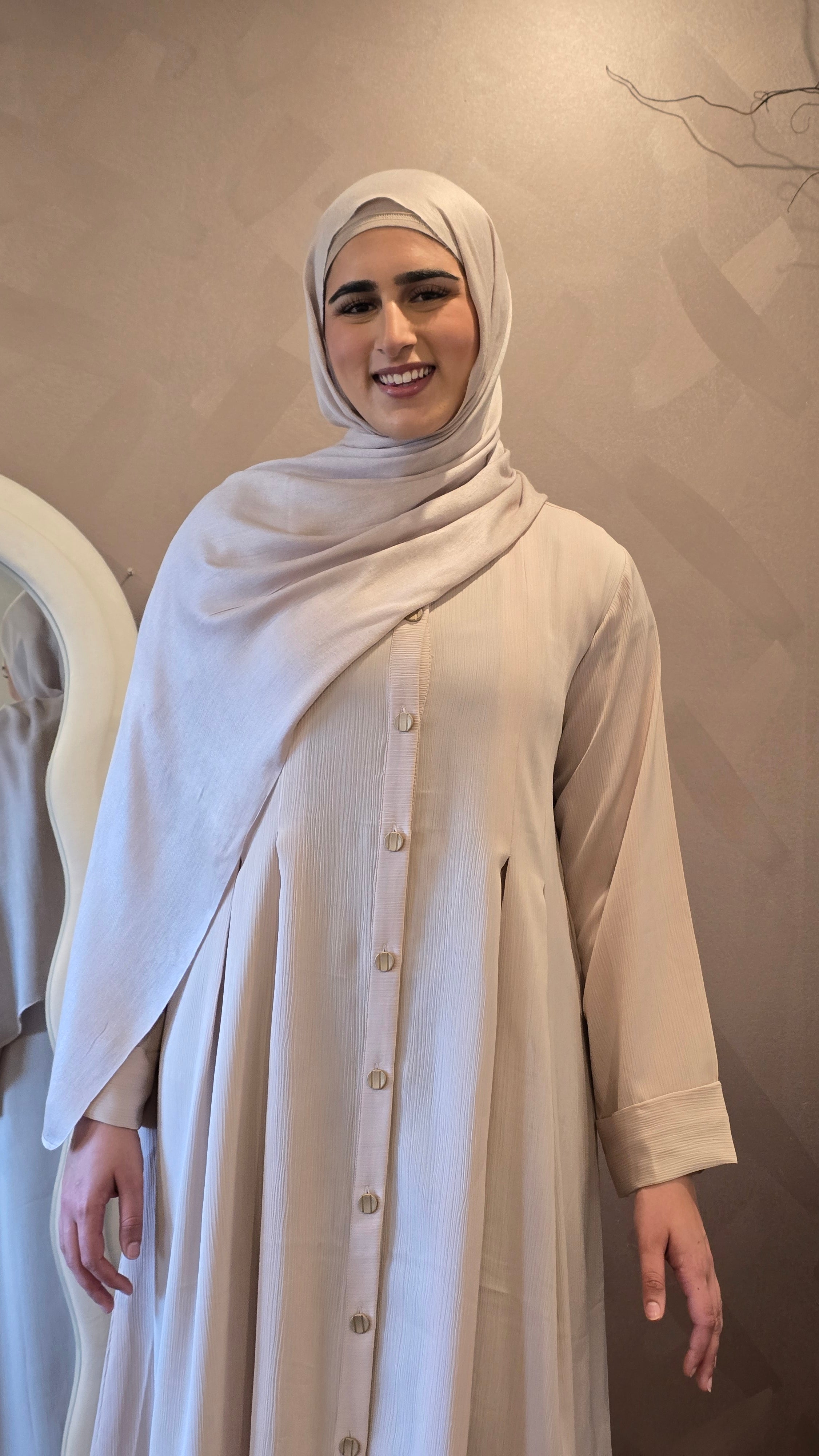 Elegant light peach hue that adds a soft, regal touch. Gold buttons run down the front, offering a luxurious accent. Flowy silhouette crafted from soft, draping fabric for graceful movement. Front-open design for ease and versatility in styling. Long, slightly wide sleeves for modest coverage. High collar detail, adding a structured, refined edge. Subtle pleats from the waist down for added volume and femininity.