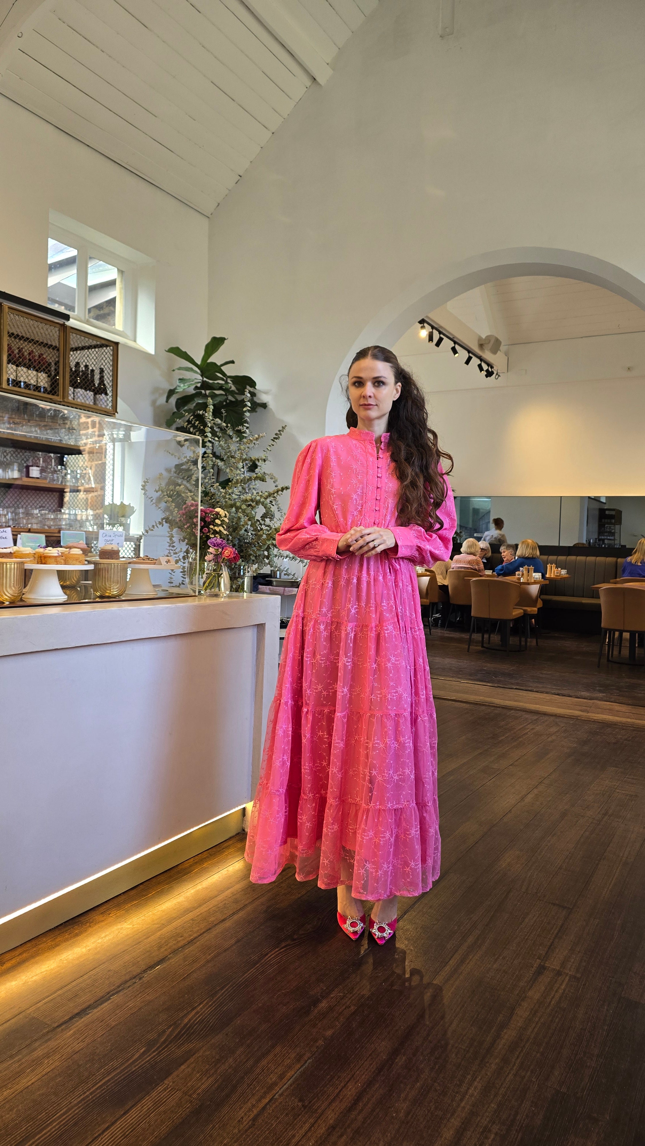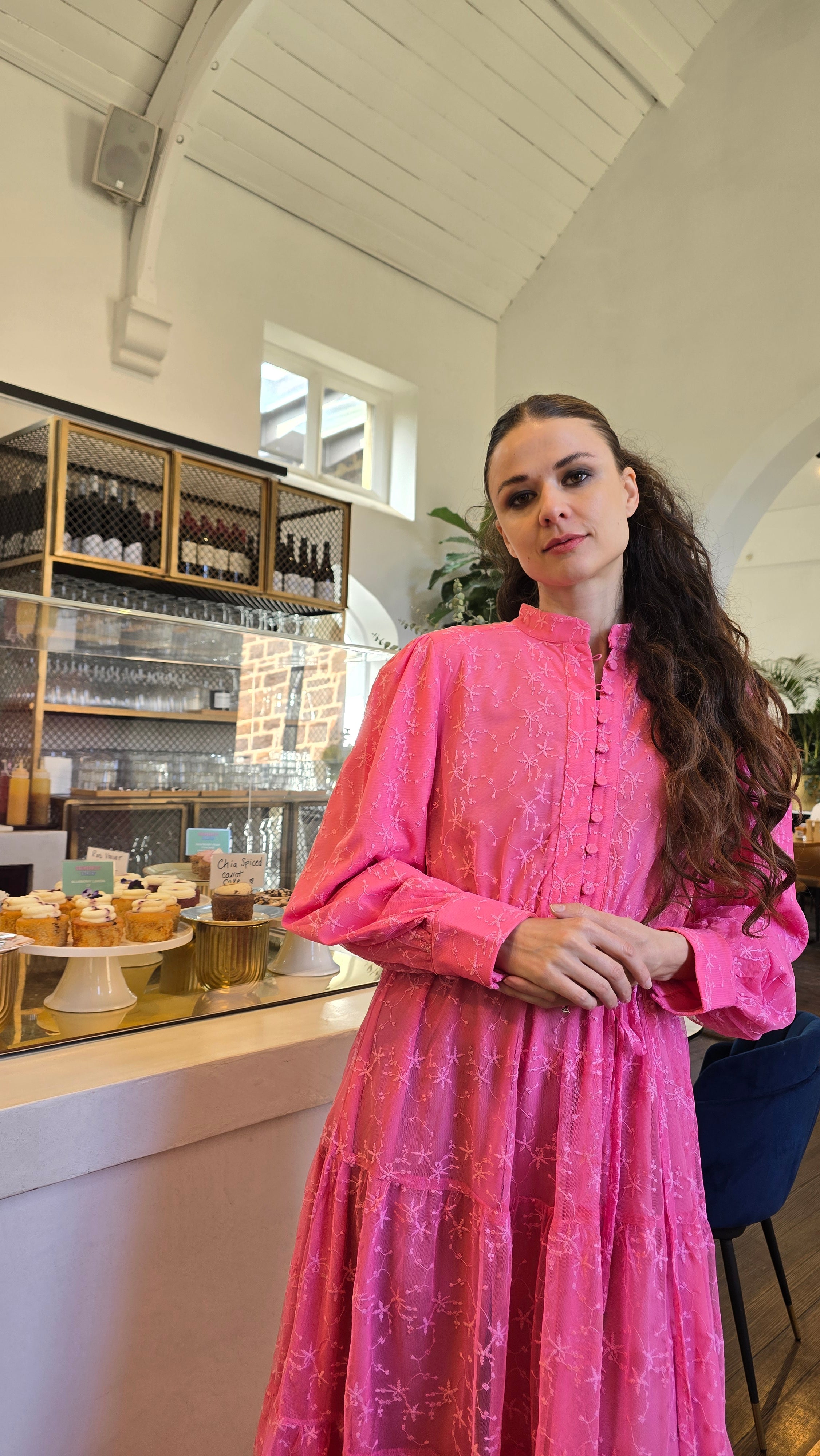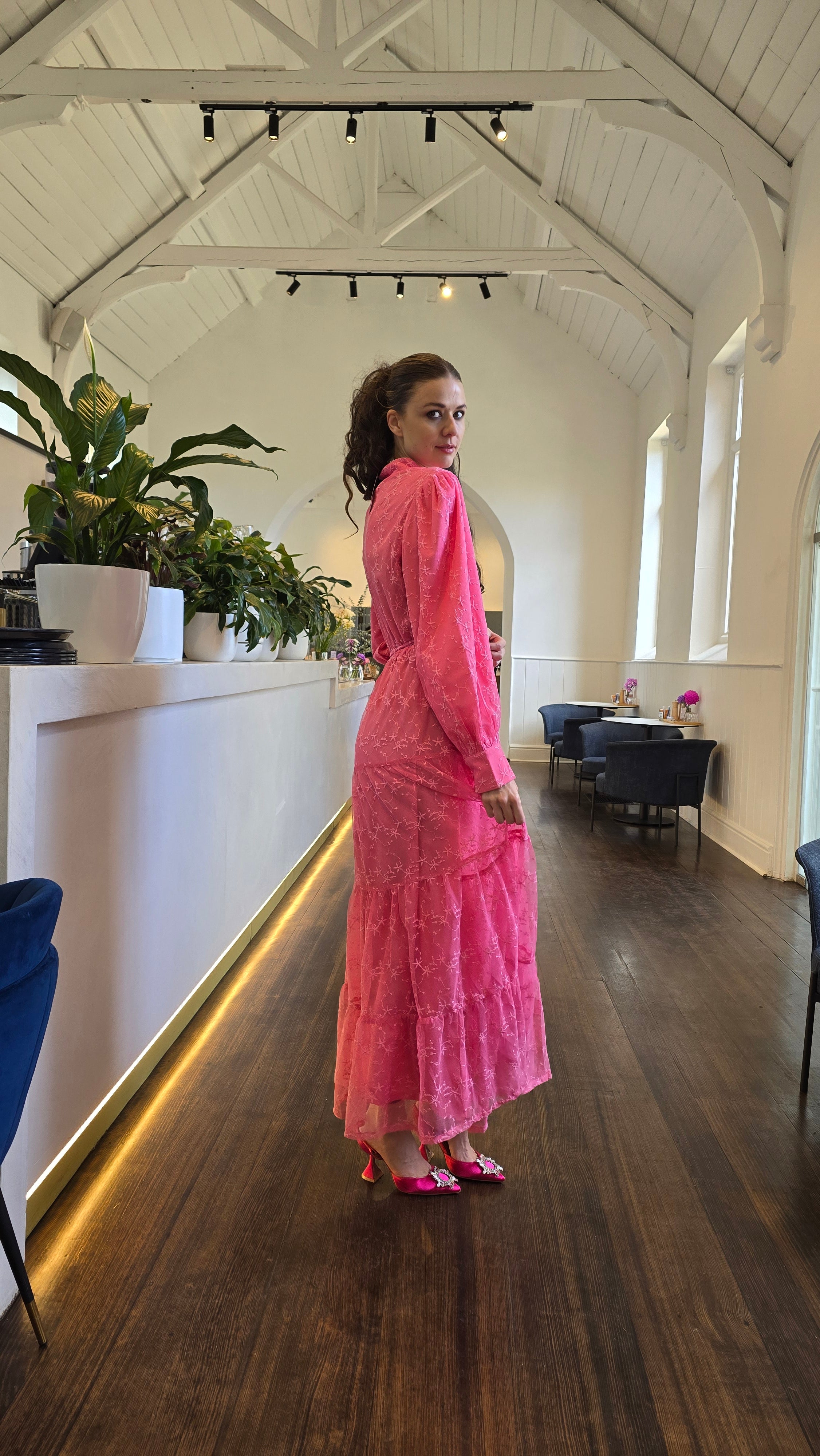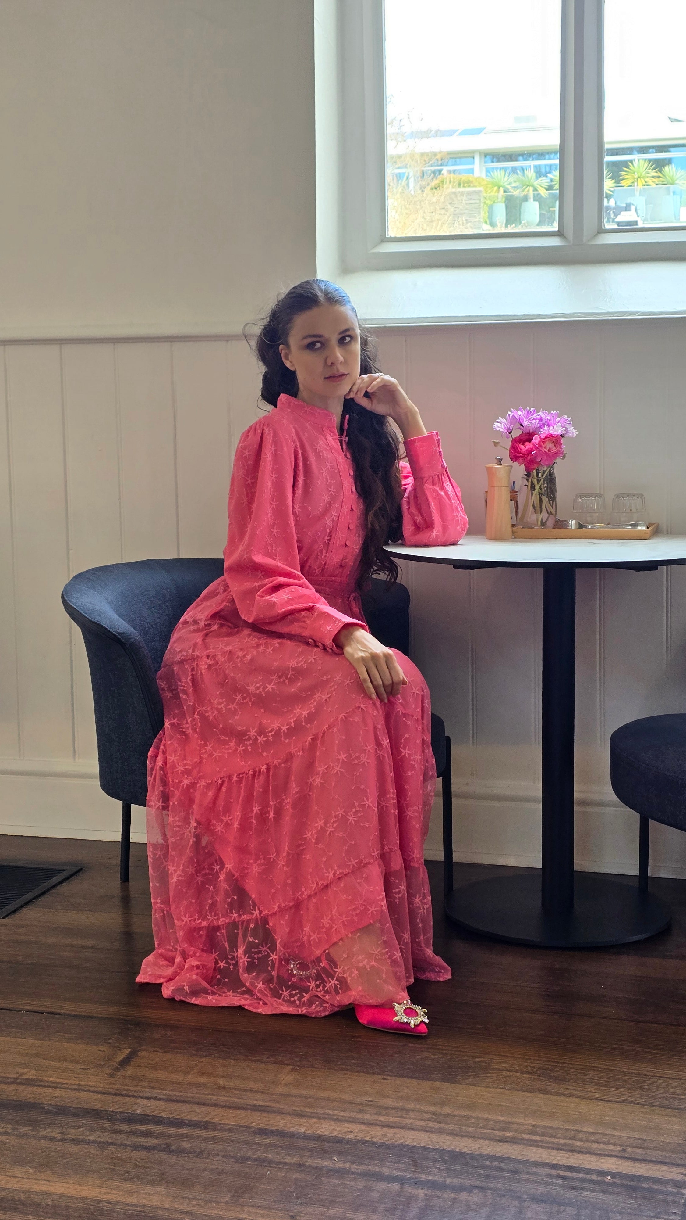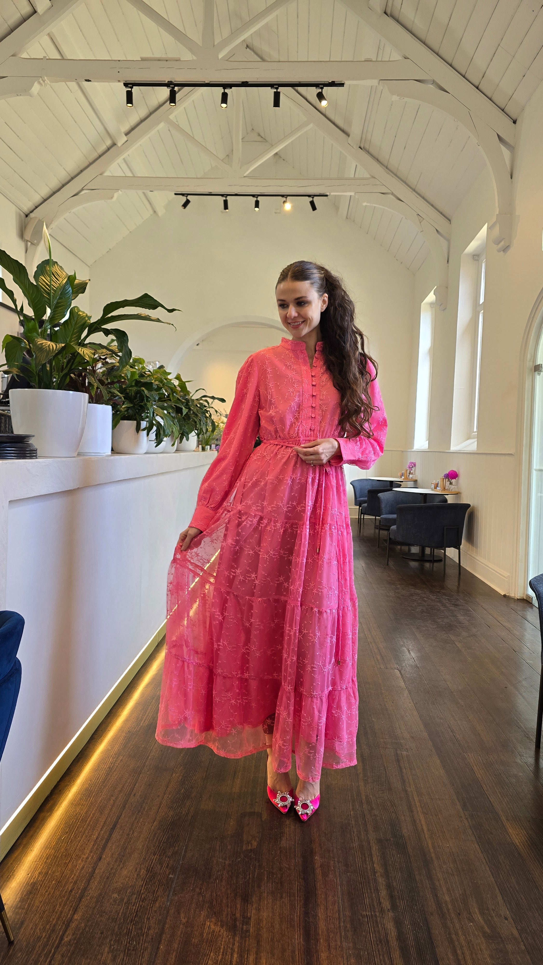 Crafted from lightweight embroidered net fabric, this dress features a fully lined design with a tiered skirt and long sleeves. It includes an elasticized waist for comfort and a removable waist tie for versatile styling.