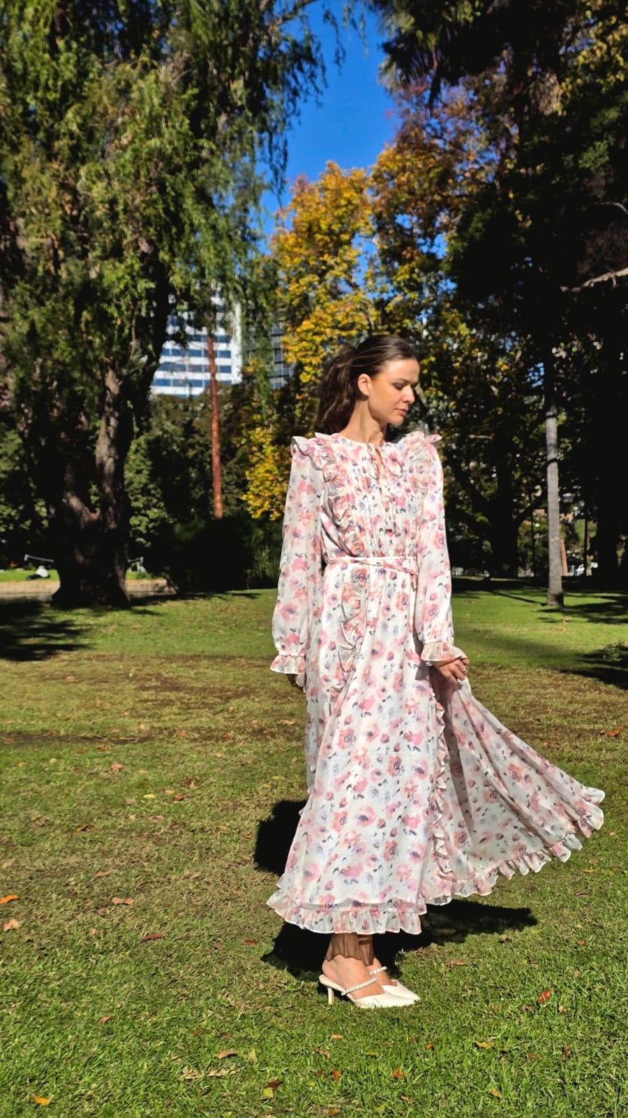 Crafted from lightweight chiffon, this maxi dress features full lining and delicate ruffled trims along the shoulders, bodice, and skirt. It includes an elasticated waist with an adjustable tie for a customized fit, complemented by a V-neckline with a tie detail. The skirt flows gracefully, enhanced by a ruffle trim for added movement and elegance.