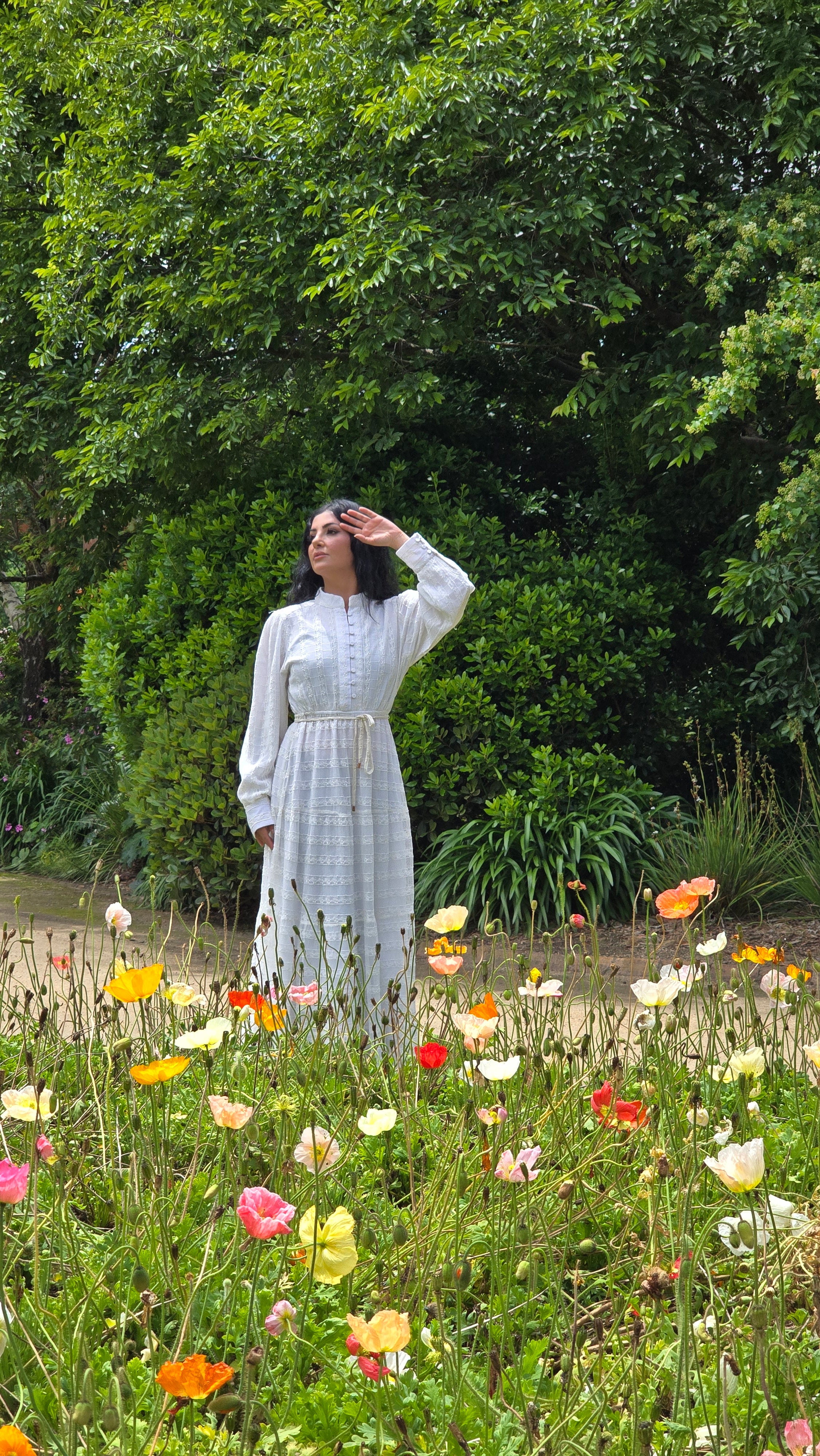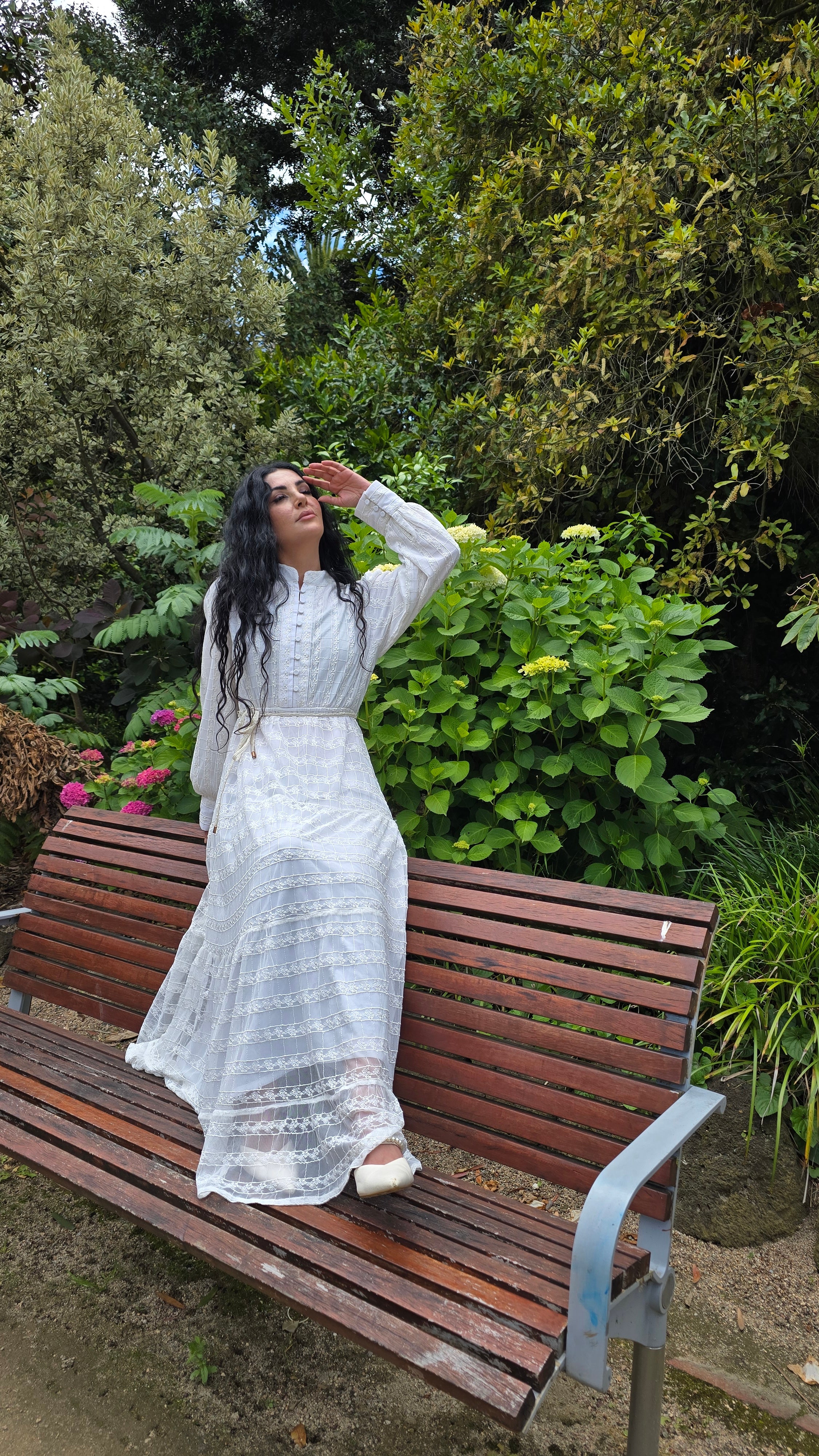 Crafted from lightweight embroidered net fabric, this dress features a fully lined design with a tiered skirt and long sleeves. It includes an elasticized waist for comfort and a removable waist tie for versatile styling.